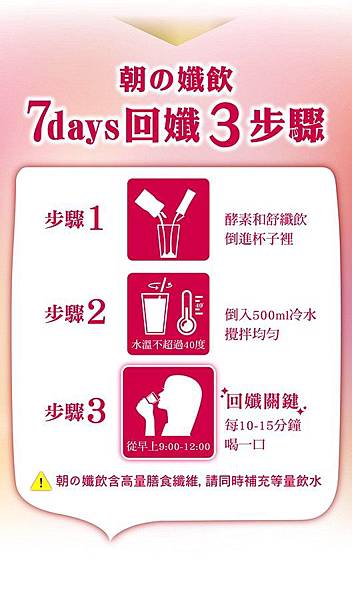 我如果工作在早上,就會先沖泡好一壺500ml帶在身上,把它當作早餐的飲品.女生喝飲料都是一口口慢慢喝,剛好<朝の孅飲 黃金雙效激孅>每10-15分鐘喝一口也是這樣.一口一口慢慢喝,不要牛飲興沖沖的一口氣喝光,酸酸甜甜的滋味讓小克好喜歡喔!再配上一杯約500ml的開水,飽足感更是加倍,早上再也不用擔心沒吃早餐沒有精神.補充足夠的水分和纖維更重要.